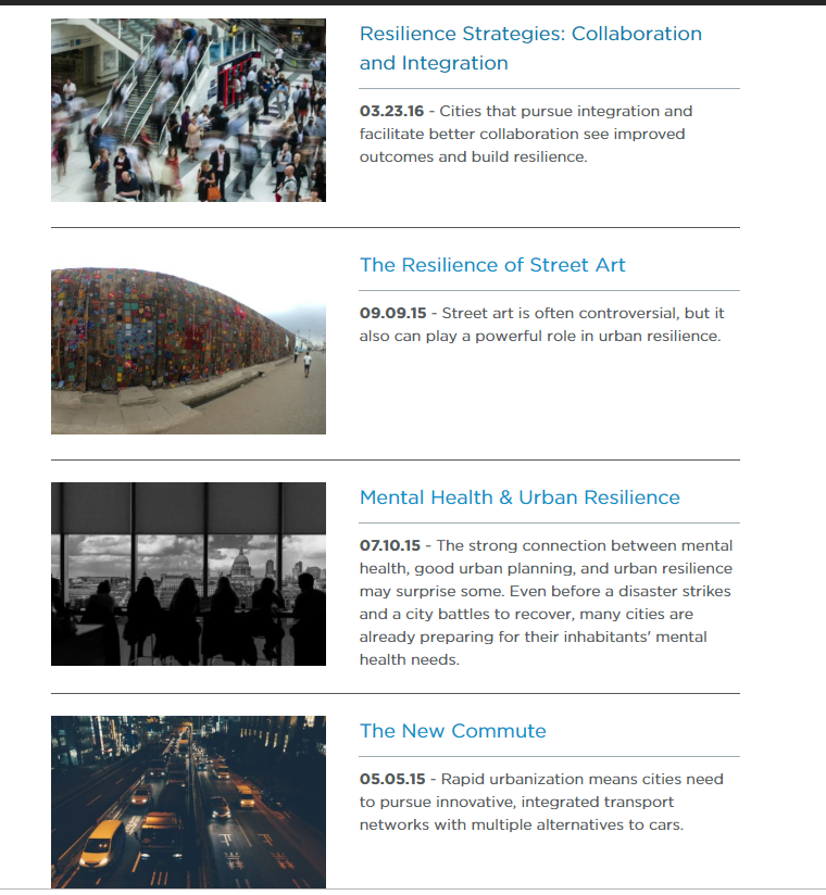 I conceived, researched, and wrote feature articles for the Rockefeller Foundation’s 100 Resilient Cities initiative blog. The articles highlight a vast range of issues pertinent to the initiative’s global mission to share insight, experience, and inspiration with cities and citizens, to improve urban livability and adaptability around the world.
